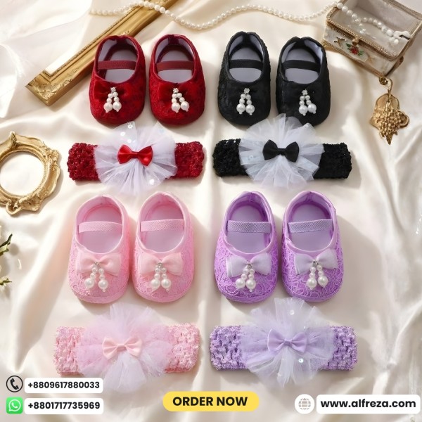 are specially designed for your little princess, combining elegance, comfort, and safety. Crafted with soft lace fabric and adorned with charming pearl details, these shoes add a royal and graceful touch to your baby’s outfit.