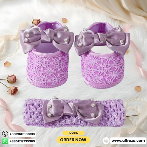 Pearl Dot Baby Shoes are designed to give your baby a perfect mix of comfort and elegance. Made with soft lace fabric and decorated with a charming bow and pearl dot details, these shoes add a premium and adorable look to your baby’s outfit.