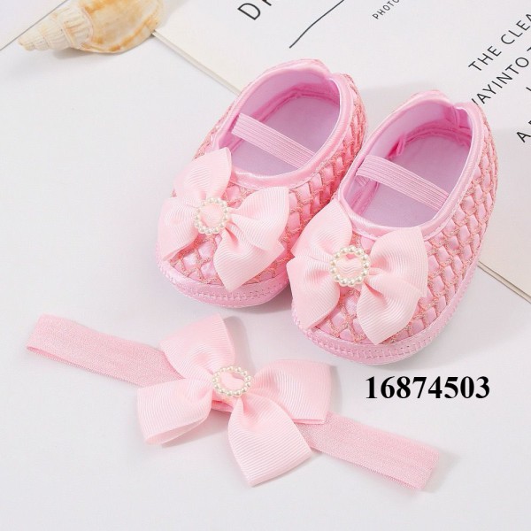 ০-১২ মাস মেয়ে বাবুর জন্য Round Stone Shoes With Hairband Pink